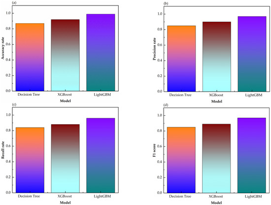 Figure 7. Plot of the training effect of different classification models: (a) accuracy rate; (b) precision rate; (c) recall rate; (d) F1 score.