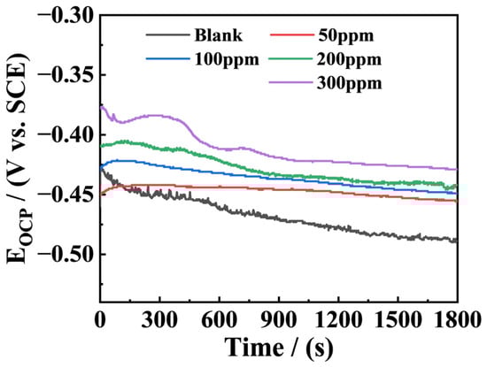 The OCP plot (Figure 2) revealed that an immersion time of 1800 s was sufficient to obtain a stable OCP for both inhibited and uninhibited systems. Unprotected steel exhibits the most negative potential, probably due to the metal forming an oxide film in air that dissolves rapidly in solution. In addition, the OCP gradually shifts in a positive direction with increasing PDINN concentration, suggesting that it has a much greater effect on metal dissolution compared to the cathodic behavior of the corrosion process [,].