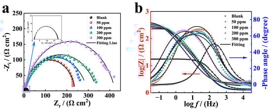 EIS curves for steel electrodes were obtained for various concentrations of PDINN at 298 K. Based on the Nyquist plot (Figure 3a), it can be observed that each capacitive loop is an imperfect semicircle, and their diameters increase with the concentration of PDINN. Imperfect capacitive loops are the product of frequency dispersion due to the rough electrode surface and the unevenness of the active sites caused by corrosion [,]. Thus, it can be shown that PDINN adsorbs on abrasive surfaces. The impedance curves generated at different corrosion inhibitor concentrations (including blank) are almost identical in shape, indicating that the incorporation of PDINN has not altered the corrosion response. In the Bode plot (Figure 3b), all curves have only one time constant; their highest phase angle and impedance modulus indicate that the corrosion reaction is completed in one step, and both increase with increasing PDINN levels, implying that the unevenness of the electrode surface decreases with PDINN coverage.
