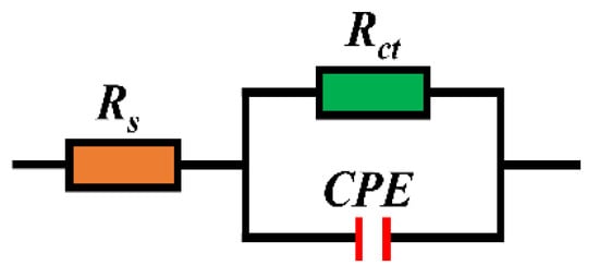 where denotes the scale factor, is the angular frequency, j expresses the imaginary root (j = (−i)1/2) and n is the phase shift (−1 ≤ n ≤ 1). It illustrates the degree of surface roughness or inhomogeneity of the electrode. In conjunction with this, the double-layer capacitance (Cdl) is obtained from Equation (3) []: