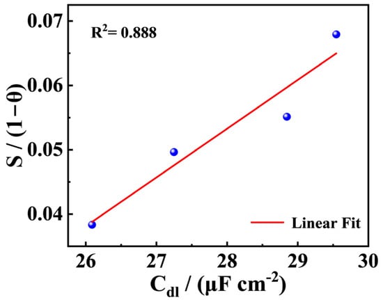 Figure 5 illustrates the relationship between different Cdl values and the active area (S) in the presence of PDINN. It is clear that the relationship is linear (R2 = 0.888) and that and d are constant. This indicates that the adsorption membrane is a monolayer and of constant thickness []. With increasing concentrations of PDINN, Cdl decreases as more molecules are adsorbed onto surface, as can also be seen in Table 1, which means that PDINN replaces the water molecules at the interface and increases the thickness of the adsorption film, thus protecting the metal substrate from corrosion. Also, the barrier reduces the area of electrodes that may be oxidized [,].