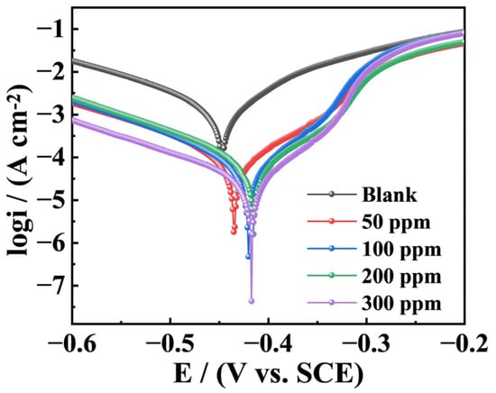 Figure 6 shows the kinetic potential polarization curves of Q235 steel at 298 K with various levels of PDINN. The relevant corrosion kinetic parameters are presented in Table 2, where Ecorr refers to corrosion potential, and βa and βc are the anodic and cathodic slopes, respectively. IETP can be acquired from Equation (6) []: