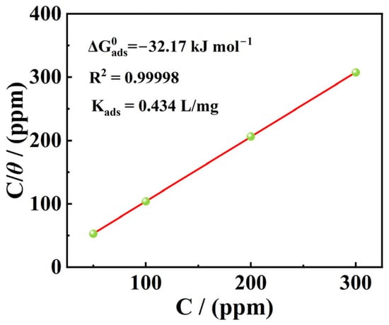 After determining an appropriate adsorption model, we were able to calculate the . Using this value, one can calculate the free energy of standard adsorption (). The relationship between them is given by Equation (8) []: