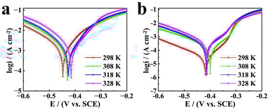The influence of temperature on the corrosive procedure of the electrode (a) without and (b) containing 300 ppm PDINN.