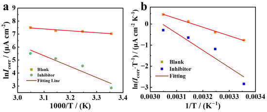 Here, K is the pre-exponential factor. is the activation energy, R is the gas constant (8.314 J/mol·K) and T is the temperature. was obtained from Figure 10, and the results are presented in Table 3. Upon adding the PDINN, the energy barrier of the corrosion process became higher, indicating that it makes it more difficult to achieve the electrochemical corrosion of Q235 steel. Other thermodynamic parameters, such as the activation enthalpy (ΔHa) and activation entropy (ΔSa), are crucial for understanding the energy barrier and disorder changes during the corrosion process. These parameters are governed by the transition state theory equation []: