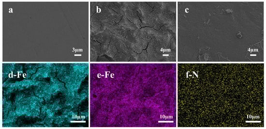 Corrosion morphology of steel surfaces: (a) not immersed; (b) immersed in HCl-0 ppm; (c) immersed in HCl-300 ppm. Elemental distribution of steel surfaces: (d) immersed in HCl-0 ppm; (e,f) immersed in HCl-300 ppm.