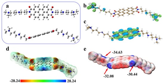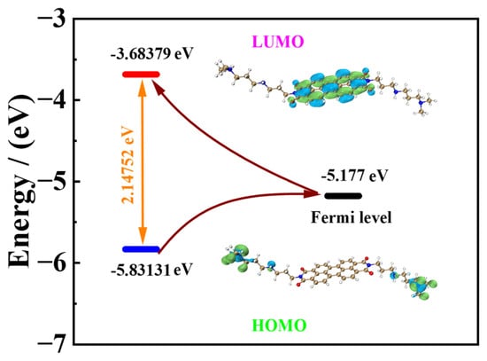 An optimized conformation of PDINN at the level of B3LYP (D3)/6-31 g * was obtained using Gaussian16 []. At the same time, SMD was used to consider the polarization of H2O []. In addition, the distribution of front molecular orbitals (highest occupied orbital, HOMO; lowest unoccupied orbital, LUMO) and their energy gap () and other quantum chemical parameters were also obtained. Finally, the electrostatic potential (ESP) of optimized PDINN was analyzed and the data were post-processed using Multiwfn [] and VMD [] software.