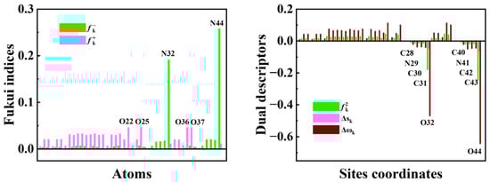 To identify the local reactive sites in the inhibitor molecules, various quantum chemical descriptors were calculated, including the Fukui indices (), global hardness (), global softness (), electronegativity (), electrophilicity (), local softness (), local electrophilicity () and dual local descriptors (). In general, higher or values of atoms exhibit a greater ability to receive or donate electrons, respectively, and are therefore more susceptible to attack by nucleophilic or electrophilic agents []. For PDINN (Figure 14), numerous carbon atoms and O22, O25, O36 and O37 have high values, indicating a strong susceptibility to nucleophilic attack at these positions. On the other hand, the side-chain atoms including N32 and N44 have high values, and these atoms are vulnerable to electrophilic attack. In addition, Figure 14 shows the local dual descriptors () for PDINN. In general, site descriptors that tend toward pro-nuclear attack have negative values, while positive values indicate that these sites tend toward electrophilic attack [,]. The values of the PDINN side-chain atoms are less than zero, while those of the central ring are greater than zero, indicating that the atoms of the central ring may accept electrons from the Fe surface and adsorb onto the surface.