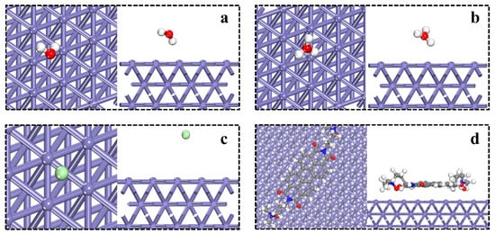 Final adsorption configuration for (a) H2O, (b) H3O+, (c) Cl− and (d) PDINN on Fe (110) surface.