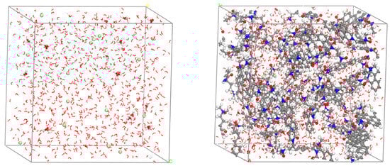 The adsorption forms of corrosive species and inhibitors on surfaces were investigated by molecular dynamics simulations (MD). The lower the adsorption energy, the stronger the inhibitor–metal interaction. Their adsorption configurations on the surface are illustrated in Figure 15, and the adsorption energies on the surface have been obtained (Table 4). The adsorption energies of all species are negative, indicating that they can spontaneously interact with Fe (110) surfaces. The order of adsorption energies is H2O > Cl− > H3O+ > PDINN, a trend that suggests that PDINN can effectively displace corrosive particles and provide a surface protection film [].
