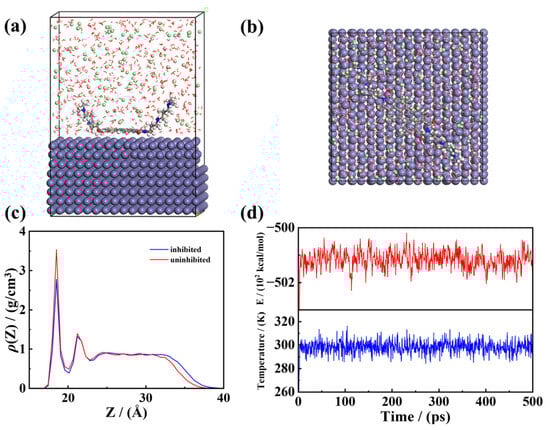 The final adsorption configuration of PDINN on a liquid phase/Fe (110) surface containing corroded particles: (a) side view and (b) top view. (c) The density distribution of H2O along the z-axis at the interface and (d) the variations in temperature (blue) and energy (red) during the simulation.