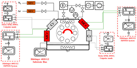 The configuration of the commercial composite coating system utilized in this study is presented in Figure 1. This system is employed for the plasma nitriding of WC-Co substrates, followed by the sequential deposition of AlCrN coatings. The tungsten carbide substrate is initially subjected to an ultrasonic cleaning pre-treatment. The initial step involves subjecting the substrate to ultrasonic cleaning using a degreasing liquid for 1 min. The second step involves conducting ultrasonic cleaning with deionized water for 1 min. The third step involves conducting ultrasonic cleaning using an alkaline solution for 10 min. The fourth step involves conducting ultrasonic cleaning with deionized water for 1 min. In the final step, the substrate is blow-dried with nitrogen and then dried in a hot air circulation oven at 70 °C for 10 min. Subsequently, it was transferred to a vacuum chamber and evacuated to achieve a base pressure of 5 × 10−6 Torr. Second, plasma nitriding was performed on the WC-Co substrate, and nitrogen was introduced to maintain a partial pressure of 8 mtorr. Under heating conditions of 300 °C, the DC power supply (Hüttinger 4020, Ditzingen, Germany) was used to apply a voltage of −1000 V to the WC-Co substrate for nitrogen ionization and bombardment treatment. The WC-Co substrates subjected to plasma nitriding treatment for 0 h (PN-0 h), 0.5 h (PN-0.5 h), 1 h (PN-1.0 h), and 1.5 h (PN-1.5 h) were subsequently coated with AlCrN using HiPIMS technology. At a temperature of 300 °C, the chamber pressure was maintained at 3 mtorr, the bias voltage of the WC-Co substrate was maintained at −60 V, and two HiPIMS power supplies (Melec SPILK 3000A, Baden-Baden, Germany), each connected to a separate Cr target (99.99%), were used to deposit a Cr layer. A CrN layer was deposited through the reaction between introduced nitrogen gas and Cr plasma to enhance adhesion to the WC-Co substrate. Subsequently, two HiPIMS power supplies (Melec SPILK 3000A), each connected to a separate AlCr target (70:30 at.%), were activated to deposit an AlCrN layer. The deposition parameters in HiPIMS mode included a fixed duty cycle of 3%, a repetition frequency of 200 Hz, a pulse turn-on time of 150 μs, a pulse turn-off time of 4850 μs, and a constant output power of 5 kW, which were applied to both the Cr target and the AlCr target. The process parameters are listed in Table 1.