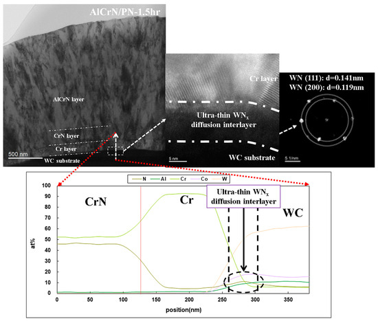 In this study, the plasma-nitriding treatment temperature was 300 °C. According to conventional nitriding methods, within this temperature range, nitrogen gas dissociates into nitrogen atoms and ions; therefore, a high bias voltage is applied to ionize the nitrogen gas, generating nitrogen atoms and ions. Therefore, to confirm that the plasma nitriding process in this study resulted from nitrogen diffusion or interstitial solid solution in the tungsten carbide substrate, a tungsten nitride hardened layer was formed. Figure 2 presents the cross-sectional TEM morphology and EDS composition analysis of the WC-Co substrate after 1.5 h of plasma nitriding, followed by the deposition of the AlCrN coating (AlCrN/PN-1.5 h). An approximately 11.5 nm hardened tungsten nitride layer was observed at the interface between the WC-Co substrate and the AlCrN coating. The selected area electron diffraction (SAED) results were consistent with the crystal structures of the WN (111) and WN (200) phases [34]. Based on the above analysis, it was confirmed that the WC-Co substrate formed a hardened tungsten nitride layer after plasma nitriding in this study.