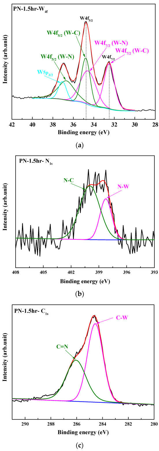 XPS analysis of the WC-Co substrate after 1.5 h of plasma nitriding treatment: (a) W4f, (b) N1s, and (c) C1s.