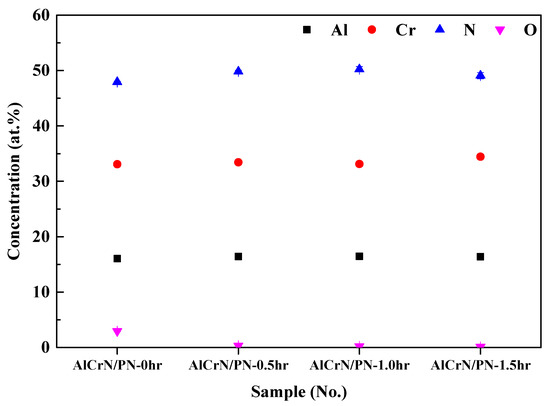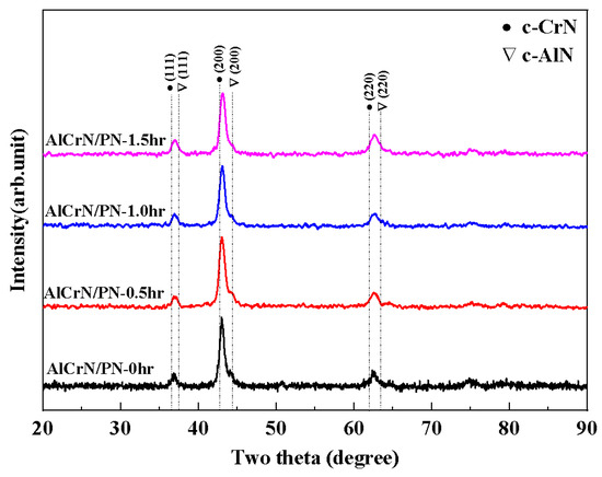 EPMA and XRD analyses were conducted to examine the composition and crystal phase structure of continuous AlCrN coatings on WC-Co substrates following different plasma nitriding durations. Figure 6 presents the EPMA composition analysis of AlCrN coatings continuously deposited on WC-Co substrates after various plasma nitriding durations. The results indicate that the compositional ratios of elements in the continuously deposited AlCrN coatings remained largely unchanged between the WC-Co substrate without plasma nitriding and those subjected to different plasma nitriding durations. Plasma nitriding of the WC-Co substrate had no impact on the composition of the subsequently deposited AlCrN coatings. The elemental composition range was as follows: Al, 16.05–16.46 at.%; Cr, 33.07–33.44 at.%; N, 47.83–50.23 at.%; and O, 0.1–2.95 at.%. Figure 7 shows the XRD analysis results for the continuous deposition of the AlCrN coating on the WC-Co substrate following plasma nitriding treatment with different durations. The analysis results indicate that the AlCrN coatings primarily consisted of fcc-CrN (111), (200), and (220) crystal phases (JCPDS No. 00-011-0065), with diffraction peak angles at 37.5°, 43.7°, and 63.5°, respectively. Additionally, fcc-AlN (JCPDS No. 00-025-1495) exhibits (111), (200), and (220) crystal phases, with diffraction peak angles at 37.8°, 43.9°, and 63.8°, respectively. This study confirms that variations in plasma nitriding duration and the continuous deposition of AlCrN coatings on WC-Co substrates, with or without prior plasma nitriding, do not influence the crystal phase, preferred orientation, or intensity of the AlCrN coatings.