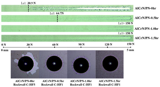 Rockwell indentation analysis was conducted to assess adhesion, determining the adhesion grade based on DIN 4856 specifications and various criteria. The critical loads (LC1, LC2) were used to evaluate scratch resistance; LC1 represented the onset of cracking, while LC2 indicated coating delamination, exposing the substrate. Figure 8 presents the Rockwell indentation and scratch test results for the continuously deposited AlCrN coatings on WC-Co substrates following different plasma nitriding durations. The results indicate that for the AlCrN coating continuously deposited on a WC-Co substrate without plasma nitriding, the critical load LC1 was 30.9 N, and the Rockwell indentation was classified as HF5. Through the film layer design in this study, incorporating a Cr metal layer and a CrN layer enhances the adhesion between the AlCrN coating and the WC-Co substrate. H. Caliskan et al. [44] reported that double-layer, progressive-layer, and multilayer designs enhance thin-film adhesion and mechanical properties. However, the ability to improve adhesion through film design is limited. Therefore, this study examines the adhesion of continuously deposited AlCrN coatings following plasma nitriding treatment. As the plasma nitriding duration increased from 0 h (AlCrN/PN-0 h) to 1.5 h (AlCrN/PN-1.5 h), the critical load LC1 rose from 30.9 N to over 150 N, while the Rockwell indentation rating improved from HF5 to HF1. As mentioned above, a Cr interlayer and a CrN layer were incorporated between the WC-Co substrate and the AlCrN coating, resulting in a critical scratch load of up to 30.9 N. The critical load of the duplex surface-treated AlCrN coating, following plasma nitriding and surface deposition, exceeds 150 N. Radial cracks were observed in the Rockwell indentation morphology analysis. With an increase in the plasma nitriding duration of the tungsten carbide substrate to 1.5 h, radial cracks gradually diminished, became more refined, or disappeared. The literature has indicated that combining plasma nitriding with surface coating can form a nitride diffusion layer between the coating and the substrate, create a hardness gradient, reduce mismatch, and enhance adhesion between the coating and the substrate [20,22,45].