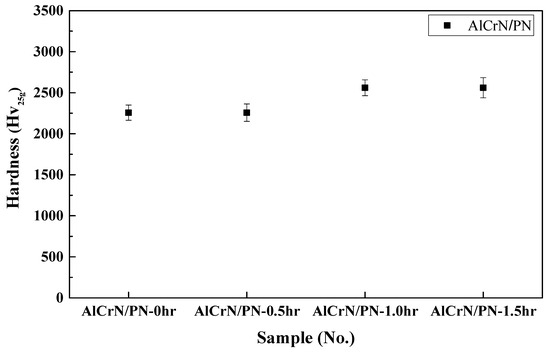 Hardness analysis results for the continuous deposition of the AlCrN coatings on the WC-Co substrates following plasma nitriding treatment with different durations.