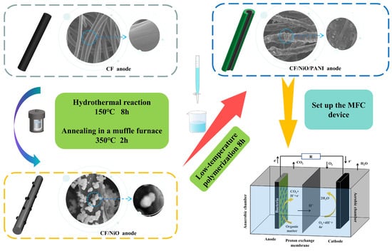 Next, 20 mL of 1.5 mol/L sulfuric acid solution was prepared. Then, 10 mL of 1.5 mol/L sulfuric acid solution was taken, and 0.01 mol of aniline (A.R.99.5%, Ronen Technology (Beijing) Co., Ltd., Beijing, China) liquid was slowly added to it. This mixture was placed on a magnetic stirrer at room temperature and stirred for 30 min. Simultaneously, 7 mL of 1.5 mol/L sulfuric acid solution was taken, and 0.02 mol of ammonium persulfate (99.99%, Ronen Technology (Beijing) Co., Ltd., Beijing, China) powder was slowly added to it. This mixture was also placed on a magnetic stirrer at room temperature and stirred for 30 min. Subsequently, the CF/NiO electrode was placed into the stirred aniline solution, and the stirred ammonium persulfate solution was then slowly dripped into the aniline solution containing the CF electrode. This process was carried out under ice bath conditions, with low-temperature polymerization occurring for 8 h. Finally, the prepared electrode was removed and repeatedly rinsed with distilled water. The rinsed electrode was placed in a drying oven and dried for 24 h, resulting in the CF/NiO/PANI electrode. The synthesis schematic diagram of the CF/NiO/PANI anode for the battery is shown in Figure 1.