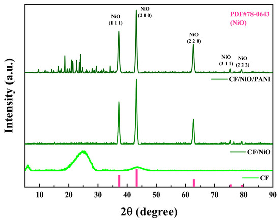 The crystal phase and structure of the experimentally prepared composite materials were characterized using X-ray diffraction (XRD). As shown in Figure 5, the diffraction peaks of the composite material CF/NiO at 2θ = 37.2°, 43.2°, 62.8°, 75.3°, and 79.4° correspond to the (111), (200), (220), (311), and (222) planes of face-centered cubic NiO (PDF#78-0643). This confirms the successful preparation and loading of NiO, and no significant impurity peaks are observed, indicating the high purity of the prepared material. For CF/NiO/PANI, the NiO peaks (37.1°, 43.2°, 62.8°, 75.3°, 79.2°) remained prominent, demonstrating that PANI deposition does not alter the crystallinity of NiO. Notably, weak diffraction peaks were observed between 10° and 30° in CF/NiO/PANI, which were absent in CF/NiO. These features were attributed to the partial ordering of PANI chains induced by interfacial interactions with NiO, as supported by XPS analysis (e.g., in Figure 4F, N 1s peak at 401.8 eV for Ni2⁺-N coordination). Such interactions were found to promote local alignment of PANI chains, generating weak diffraction signals typically associated with π-π stacking (15°–25°). However, the broad and low-intensity features suggested that PANI remained predominantly amorphous, consistent with its low crystallinity in composite systems. These diffraction peaks appear to result from the overlap of NiO peaks and PANI peaks. The peak intensities indicated that the surface-deposited PANI did not significantly affect the crystallization characteristics of NiO [28,29,30]. It is noteworthy that the loading of polyaniline preserved the crystalline structure and pseudocapacitive properties of NiO while enhancing electrode biocompatibility. Strong interfacial interactions were formed among polyaniline, CF, and NiO, leading to significantly improved MFC output power. This configuration achieved dual functionality for simultaneous power generation and energy storage, ultimately enhancing the performance of the MFCs.