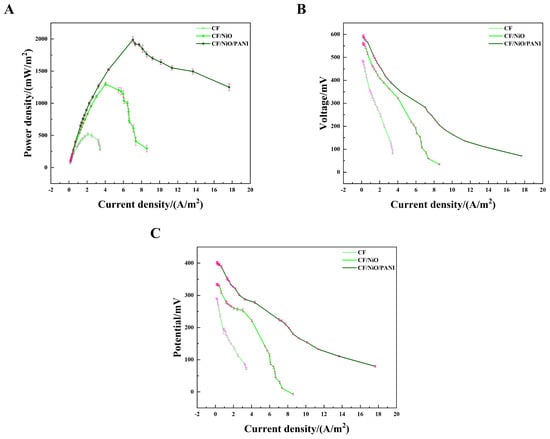 The value of the CF/NiO electrode is 0.98 ± 0.04 F/cm2. This indicates that, at the same current density (1.25 mA/cm2), its capacitance performance is 24.5 times higher than that of the blank CF electrode (0.04 F/cm2). The value of the CF/NiO/PANI electrode is 18.91 F/cm2. At the same current density, its capacitance performance is 472.8 times higher than that of the blank CF electrode (0.04 F/cm2) and 19.3 times higher than that of the CF/NiO electrode (0.98 ± 0.04 F/cm2). When the current density is 1.25 mA/cm2, the chronopotentiometry (CP) curve of CF/NiO resembles the shape of an isosceles triangle (Figure 6E). This observation is highly consistent with the typical high capacitance performance of a double-layer capacitor. Meanwhile, the repetitive data from multiple independent experiments (Figure 6F) indicate the stability of the electrode and the feasibility of the experimental method. In addition, the combination of NiO and PANI is conducive to promoting a good ion diffusion rate, enabling the electrode to have an excellent energy storage capacity as well as superior cycling performance. It is precisely due to the enhanced charge storage performance of NiO and the efficient reversible redox reaction pseudocapacitance characteristics of PANI, along with its good conductivity and biocompatibility, that the CF/NiO/PANI electrode is expected to enhance the power generation capacity and charge storage performance of MFCs.