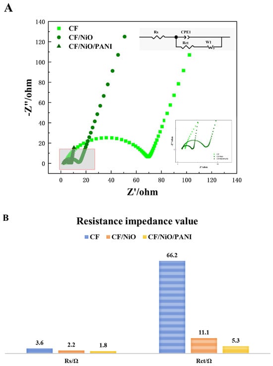 (A) EIS curves of the different anodes and (B) the resistive impedance values of the three electrodes.