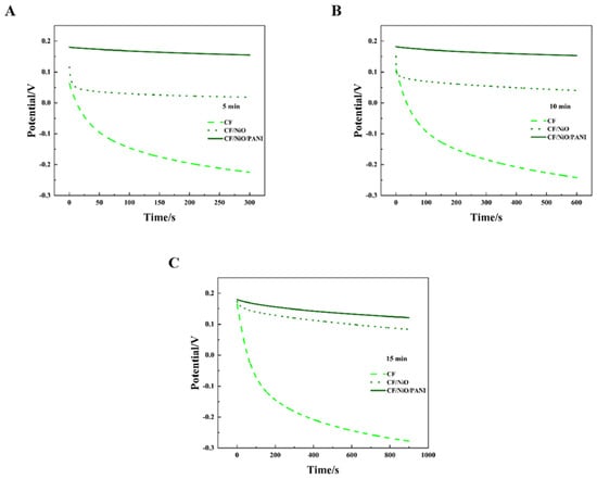 Figure 9A–C show the open circuit potential–time profiles of MFCs with electrodes CF, CF/NiO, and CF/NiO/PANI when an external 200 Ω resistor is connected during charging periods of 5 min, 10 min, and 15 min, respectively. It is worth noting that the potentials of the three anodes all exhibited a similar downward trend in the open circuit potential–time curves at 5 min, 10 min, and 15 min. However, distinct differences in decay rates were observed among the anodes in each dataset. Among them, the blank CF anode has the most pronounced decline, followed by the CF/NiO anode, while the CF/NiO/PANI anode exhibits the weakest downward trend. In Figure 9C, the blank CF anode potential plummeted from 0.166 V to −0.278 V. In contrast, the potential change of the CF/NiO anode was relatively slow, dropping from an initial potential of 0.174 V to 0.083 V over a period of 15 min. Compared with the blank CF anode, this electrode exhibited a higher initial potential. This behavior suggests that NiO’s high electrochemical activity enhanced oxidation kinetics, while its uniform coating (Figure 8B) reduced charge transfer resistance. These combined effects enabled the CF/NiO anode to maintain a higher initial potential with suppressed current loss, thereby prolonging potential retention. Additionally and most significantly, the initial potential of the CF/NiO/PANI anode dropped from 0.180 V to 0.121 V after 15 min. This 0.059 V decay was significantly smaller than the 0.444 V and 0.091 V losses observed for the blank CF and CF/NiO anodes, respectively. The incorporation of NiO provided a larger specific surface area for CF fibers, promoting the loading of PANI. Meanwhile, the pseudocapacitance characteristics of NiO and PANI, as pseudocapacitive materials, facilitated rapid N-type or P-type doping and dedoping redox reactions, ultimately leading to the enhancement of Faradaic capacitance. Therefore, the CF/NiO/PANI composite electrode stored more charges compared to the CF/NiO electrode and the blank CF electrode, achieved a higher initial potential, and exhibit better electrical conductivity and environmental stability, thereby enhancing the energy storage capacity of MFCs and slowing down the decrease in anode potential.