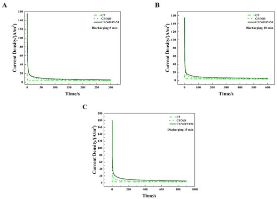 Figure 10 shows the MFC discharge curves of the three electrodes under an external resistor (200 Ω) condition at charge–discharge cycle periods of 5 min, 10 min, and 15 min. It can be seen from Figure 10A–C that the discharge curves of these three electrodes all exhibit a peak current density, after which the current density decreases over time and eventually reaches a relatively stable state. Based on the existing data, Table 2 can be obtained through calculation and visually presents the peak current density (ih), steady-state current density (is), charge storage capacity (Qs), and total charge quantity (Qt) of the three electrodes across different charge–discharge cycle periods. It can be seen from Table 2 that in the 15 min charge–discharge cycle, the peak current density (ih) of the MFC with the CF/NiO/PANI electrode reached 179.40 A/m2, which was much higher than that of the MFC with the blank CF electrode (20.00 A/m2) and the MFC with the CF/NiO electrode (110.43 A/m2). Meanwhile, the steady-state current density (is) of the MFC with the CF/NiO/PANI electrode reached 5.41 A/m2, which was much higher than that of the MFC with the blank CF electrode (3.60 A/m2) and the MFC with the CF/NiO electrode (3.86 A/m2). It is worth noting that the total charge (Qt) and stored charge (Qs) of the CF/NiO/PANI electrode reached 8175.89 C/m2 and 3304.64 C/m2, respectively, which were significantly higher than those of the blank CF electrode (Qt = 4860.50 C/m2, Qs = 1386.50 C/m2) and the CF/NiO electrode (Qt = 3552.50 C/m2, Qs = 314.75 C/m2). The total charge (Qt) and stored charge (Qs) of the CF/NiO/PANI electrode were 1.74 times and 2.38 times those of the blank CF electrode, and 2.30 times and 10.44 times those of the CF/NiO electrode, respectively. Similarly, the results of the charge–discharge tests conducted at 5 min and 10 min were consistent with the trend observed in the 15 min charge–discharge tests.