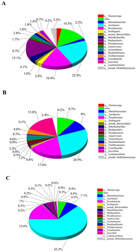 In this high-throughput test, the blank CF anode was used as the control group and labeled as A1, while the CF/NiO anode and the CF/NiO/PANI anode in the experimental groups were labeled as A2 and A3, respectively. Figure 11A–C show the pie charts of the microbial community composition structure on the anode surface at the genus level for the three anodes. It can be seen from Figure 11A that the microbial community on the surface of the blank CF anode was primarily composed of Arcobacter (22.3%), Pseudomonas (16.3%), Methanothrix (15.1%), Lentimicrobium (4.1%), and Acinetobacter (2.8%), among others. Among them, the main electrogenic bacteria such as Arcobacter, Pseudomonas, and Acinetobacter account for approximately 41.5%. Methanothrix is a non-electrogenic bacterium. In the MFC system, such bacteria only consume the organic matter in the anode chamber and cannot provide electrical energy for the system. It is regarded as a non-beneficial bacterium in the research on MFC electricity generation. In Figure 11B, the microbial community on the surface of the CF/NiO anode is mainly composed of Arcobacter (28.9%), Pseudomonas (17.6%), Geovibrio (15.7%), Marinobacter (9.0%), and Trichloromonas (4.6%). The proportion of the main electrogenic bacteria has reached 65.7%, which is significantly higher compared with the blank CF anode. This observation indicates that the loading of NiO provides more suitable environmental conditions for the attachment and metabolism of electrogenic bacteria. The microbial community on the surface of the CF/NiO/PANI anode was mainly composed of Arcobacter (63.3%), Pseudomonas (15.6%), Methanothrix (4.8%), and Marinobacterium (7.1%). Notably, the proportion of the main electrogenic bacteria reached 79.2%, which was significantly higher than that of the blank CF anode (41.5%), with the proportion of Arcobacter increasing from 22.3% to 63.3%. The results indicated that in the limited organic matter environment in the anode chamber, more organic matter was utilized by the electrogenic bacteria, reducing the metabolic consumption of non-beneficial bacteria, thereby increasing charge generation and enhancing electricity production. This can be attributed to the addition of NiO and PANI, which effectively increased the electrogenic bacterial community in the MFC, enhancing its overall performance by improving conductivity, promoting microbial attachment and growth, and enhancing electrochemical reactions. This finding is consistent with the measured power test results.