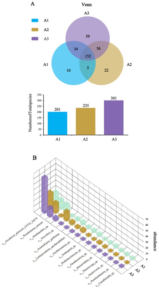 (A) Venn analysis of the CF anode (A1), CF/NiO anode (A2), and CF/NiO/PANI anode (A3); and (B) 3D column chart of species-level abundance of microbial communities.