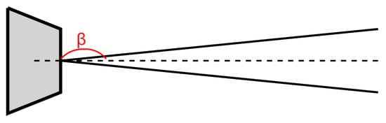 The total volume deposited in one pass is calculated using Equation (7), which combines the feed rate (), material density (), and deposition efficiency. The geometric parameter , defined in Equation (8), accounts for nozzle geometry and standoff distance effects through the exit diameter (), standoff distance (), and divergence angle () shown in Figure 1. The hypothesis behind Equation (8) is based on the assumption that the particle jet expands conically after exiting the nozzle due to turbulent mixing and momentum exchange with the surrounding ambient air. The boundary of this expansion is defined geometrically as a function of the nozzle exit diameter, standoff distance (distance from nozzle exit to substrate), and the divergence angle of the jet.