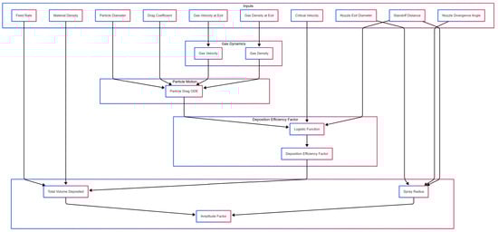 This research addresses these shortcomings by introducing a framework that remains firmly grounded in physical principles while minimizing empirically fitted parameters. The novelty lies in systematically linking typically empirical factors to the governing physics of gas flow, particle dynamics, and deposition efficiencies. Specifically, this approach replaces the bulk of empirical methods—commonly used for parameters such as the amplitude factor A and characteristic radius —with physics-based calculations. This framework establishes a direct connection between process parameters and deposition characteristics by weaving together several key elements: