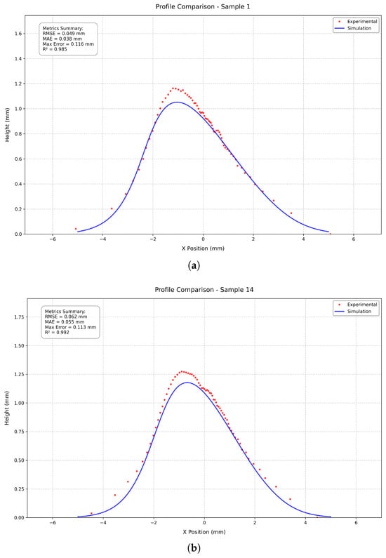 Comparison between experimental measurements (red dots) and simulated profiles (blue line) for two representative cold spray single-track deposits with different spray angles and standoff distances. The profiles demonstrate excellent agreement in both shape and magnitude across different processing conditions. (a) Profile comparison for spray angle 45°, traverse speed 25 mm/s, and standoff distance 30 mm (Sample 1). RMSE = 0.049 mm and R2 = 0.985. (b) Profile comparison for spray angle 60°, traverse speed 25 mm/s, and standoff distance 40 mm (Sample 14). RMSE = 0.062 mm and R2 = 0.992.