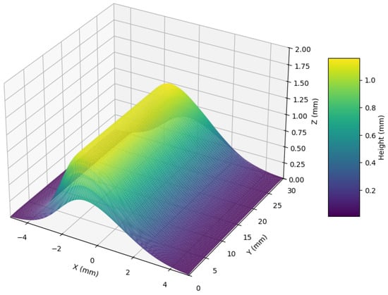 where r represents the distance from the nozzle axis, while and serve as parameters that control the shape of the distribution, typically obtained through experimental data fitting []. This Gaussian profile hypothesis assumes that the concentration of particles (or resulting coating thickness) is highest along the centerline of the jet and decays radially. Physically, this reflects the fact that an axisymmetric supersonic jet has maximum density/velocity at the core and lower values toward the periphery. If the spray distance effect and the effect of nozzle angle are added, the deposit growth in the z-axis direction becomes