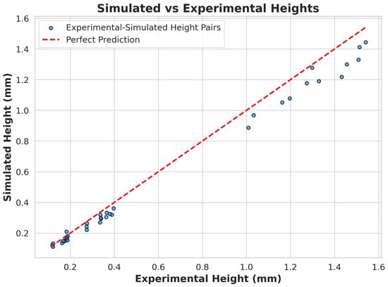 Across all 36 samples, the model demonstrated exceptional performance, with a global RMSE of 0.048 mm, MAE of 0.033 mm, and MXAE of 0.254 mm. The MAPE of 10.51% indicates strong relative accuracy across varying profile heights, while the correlation coefficient R of 0.995 and R2 of 0.991 confirm agreement with experimental measurements. Figure 6 illustrates the accuracy of the model at the maximum height through a comparison of predicted versus experimental heights across all samples.