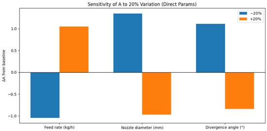 The sensitivity analysis revealed significant dependencies between key process parameters and the model’s predicted deposition behavior, particularly through variations in the amplitude factor A. Starting from a baseline amplitude factor of (corresponding to typical operating conditions: feed rate of kg/h, nozzle exit diameter of mm, and divergence angle of ), we observed distinct patterns of influence for each parameter examined.