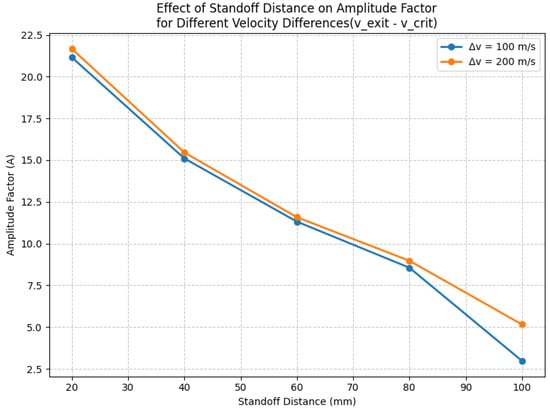 Figure 8 demonstrates the model’s sensitivity to velocity parameters across different standoff distances. The analysis reveals that the velocity difference () serves as a critical parameter controlling deposition behavior. Equation (5) shows hows how particle velocity decreases due to drag forces, with the effect becoming more pronounced at larger standoff distances. The decreasing amplitude factor reflects this velocity loss, as particles arriving at the substrate with lower velocities are less likely to achieve successful deposition. The separation between the two curves ( and 200 m/s) demonstrates the importance of the initial velocity difference. When particles start with significantly more kinetic energy than needed for deposition, this excess energy serves as a “buffer” against velocity losses during flight, allowing particles to maintain sufficient velocity for deposition, even at larger standoff distances. This explains why the orange curve ( m/s) maintains higher amplitude factors throughout the range. Particularly interesting is the behavior at longer standoff distances (80–100 mm). Here, the curves begin to converge, but the higher conditions maintain better deposition performance. At 100 mm, the amplitude factor for m/s is approximately twice that of m/s. This demonstrates how the initial velocity advantage becomes crucial for maintaining deposition efficiency at extended standoff distances.