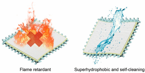 Recently, the combination of superhydrophobicity with flame retardancy has allowed materials to remain relatively stable under different harsh conditions [26,27,28], such as in chemical production, where many pieces of equipment and pipelines need to cope with both liquid leakage [29,30] and fire risks [31,32]. Superhydrophobic and flame-retardant coated pipes prevent the adhesion and corrosion of liquids on the surface of the pipes and prevent the pipes from becoming conduits for the spread of fire in the event of a fire. Similarly, superhydrophobic and flame-retardant coated fabrics can be used as protective clothing materials. It can provide better safety protection for workers in the chemical, power, and other industries to reduce the risk of chemical leakage and electrical fire. In addition, the superhydrophobic superposition can also form a protective layer, which can not only largely reduce the loss of flame-retardant components, but also reduce the need for washing textiles to a certain extent, thereby protecting the washability of the fabric [33,34]. He et al. [35] used fluorinated polymers to enhance the flame retardancy of coatings. A superhydrophobic flame-retardant coating fabric with excellent durability was prepared by modifying PDMS with fluorinating agents (1H, 1H, 2H, 2H-perfluorodecyltrimethoxysilane) and depositing a composite coating composed of fluorinated PDMS, silicone rubber combustibles, and ammonium polyphosphate on PET fabric. Huang et al. [36] immersed the cotton fabric in branched poly(ethylenimine) (BPEI) and ammonium polyphosphate (APP) water dispersions, as well as polydimethylsiloxane (PDMS)/cellulose nanocrystals (CNC)-SiO2 toluene dispersions modified with 1H, 1H, 2H, 2H-perfluorooctyltriethoxysilane (FOTS), to obtain highly efficient flame-retardant and superhydrophobic cotton fabric with good abrasion resistance. However, the surface of UHMWPE fibers has a low content of polar functional groups and low reactivity, resulting in a smooth surface and poor adhesion when made into fabric [7,37]. Therefore, how to solve the problem of insufficient adhesion performance on the surface of UHMWPE fabric and apply a coating on it remains a challenge.