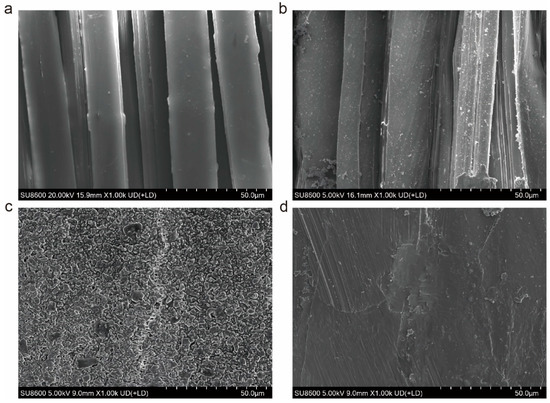 The surface morphology of UHMWPE, PUPE, FPUPE, and SFPUPE fabrics was observed by SEM, as shown in Figure 3a–d. As shown in Figure 3a, the surface of the UHMWPE fabric presents a neat fiber arrangement structure, with a smooth and clear fiber surface and uniform fiber diameter. After plasma treatment, a large amount of particulate matter or small pits can be observed on the PUPE fibers, which are evenly and densely distributed on the fiber surface, showing the rough surface structure of the fibers (Figure 3b). For FPUPE (Figure 3c), the surface morphology of the fabric becomes rough and uneven, with a significant amount of material adhering to the fiber surface to form a continuous coating. The fibers are wrapped by the coated material, and the gaps between the fibers are also filled and covered by the coated material. Figure 3d shows the microstructure of SFPUPE, which is different from the rough state of the FPUPE surface, and the addition of the superhydrophobic coating results in a continuous, dense, and flat surface morphological structure on the surface of the fabric.