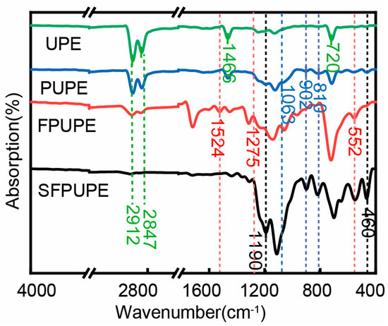 FTIR spectra of UPE, PUPE, FPUPE, and SFPUPE.