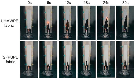 Figure 6 shows the photos of UHMWPE fabric and SFPUPE fabric in the VBT process. UHMWPE fabric burns rapidly after contact with a flame, accompanied by curling and shrinkage, and continues to burn upward after leaving the ignition source until it is completely burned out. During combustion, there is melt dripping, and there are afterflames and afterglow. SFPUPE fabric is not easy to burn when in contact with the flame, and it immediately stops burning after leaving the fire source, without afterflame or afterglow, and exhibits great flame-resistance.