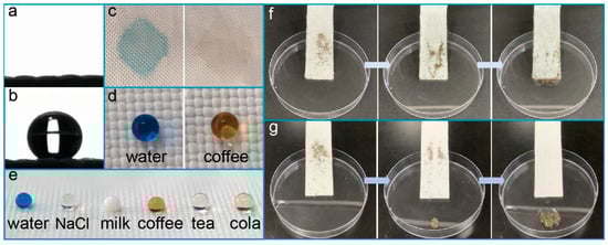 Liquids of different pH and color (such as sodium chloride, cola, milk, tea, water, etc.) were dropped on the surface of UHMWPE fabric and SFPUPE fabric to observe their surface changes, as shown in Figure 7c–e. It can be seen that the droplets on UHMWPE fabric completely penetrate the surface of the fabric, and the liquid rapidly diffuses to absorb and leave dye traces on the surface of the fabric (Figure 7c). In contrast, the droplets on SFPUPE fabric do not penetrate the fabric and spread across the fabric surface, but instead remain spherical shape on the surface of the coated fabric and roll freely (Figure 7d,e). The droplets roll off without leaving any color or marks on the surface of the fabric, indicating that the coated fabric has a certain degree of dyeing resistance. In response to the self-cleaning properties of fabrics, an equal amount of gravel was sprinkled on the surface of UHMWPE and SFPUPE fabrics, respectively, and then rinsed with an equal amount of water. It can be seen that the surface of UHMWPE fabric has good hydrophilicity, and the water droplets are first quickly absorbed by the fabric after dripping, and the surface grit does not change. After further dripping, a small amount of gravel on the surface of the fabric is carried away or washed away by the water droplets, and a large amount of grit remains on the surface of the fabric. Eventually, all the gravel cannot be completely cleaned and still adheres to the surface of the fabric, making it difficult to clean (Figure 7f). SFPUPE fabric has great superhydrophobicity, taking away a large amount of gravel immediately after the water droplets droplet, and there is no gravel residue in the path through which the water droplets flow. Finally, the gravel on the surface of the fabric is completely cleaned with no residue on the surface (Figure 7g). The color of the fabric is also not contaminated, indicating that SFPUPE fabric self-cleans well.