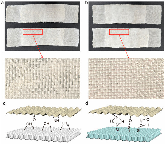 Two pieces of UHMWPE fabric and two pieces of PUPE fabric were bonded together by coating, and then the two layers of fabric were vigorously peeled off. The peeling of the surface coatings of the fabrics was observed, and the effect of plasma treatment on the adhesion between the coating and the fabric was discussed, as shown in Figure 11. After the UHMWPE fabric was coated and then peeled off (Figure 11a), it can be seen that the coating on the surface of the fabric surface has peeled off and the fibers are exposed. The surface of the coated fabric becomes mottled, and the exposed area of the fabric after peeling off is 12%, indicating that the adhesion effect between the coating and UHMWPE fabric is poor. After the PUPE double-layer fabric is coated and then vigorously peeled off (Figure 11b), the two pieces of fabric are separated, but there is no separation between the fabric and the coating. The fabric on both sides is still completely covered by the coating, and there is no peeling off of the coating and bare fabric fibers, indicating that the peeling strength of the coating is high, and the adhesion effect between the coating and PUPE fabric is excellent. Figure 11c,d illustrate the effect of plasma treatment on the surface of the fabric. The methylene groups on the surface of UHMWPE fabric without plasma treatment have no polarity and cannot be polarly connected with the carbonyl and amino groups in the coating, resulting in poor adhesion between the fabric and the coating. The surface of the fabric after plasma treatment is activated with silanol groups, which can be dehydrated with the amino groups in the coating to form covalent bonds. The fabric and the coating are connected by hydrogen bonds, resulting in good adhesion performance. Therefore, plasma treatment can provide more and more uniform binding sites for subsequent coating and fabric surface, improving surface adhesion.