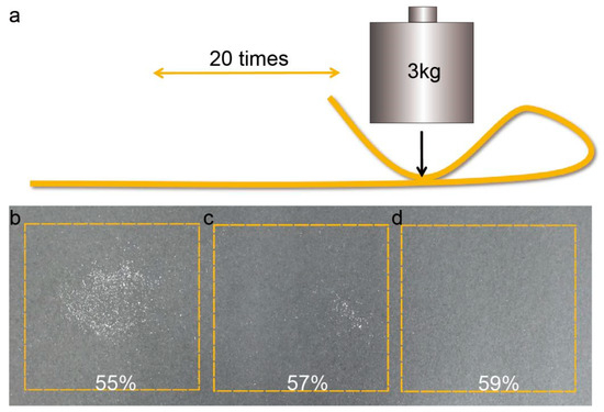 The dropping of the coating powder was observed after repeated mechanical action on UHMWPE-coated fabrics with different PU additions (Figure 12a), and the optimal amount of adhesive was explored. Here, we use an additional external force to perform a test method of repeated friction, the force value is set at 3 kg, the number of repetitions is 20, and the specimen size is 10 cm × 20 cm. As shown in Figure 12b–d, when the proportion of PU is 55%, a large amount of white powder falls off after the external force, indicating that the amount of PU added at this time has a bad bonding effect on the flame retardant, and the coating falls off easily under the action of external force. When the proportion of PU is increased to 57%, a small amount of white powder falls off the fabric after the action of external force, indicating that the ideal adhesive effect has not been achieved at this time. When the proportion is increased to 59%, the coated fabric under the action of external force does not see the white powder falling, the bonding effect is good, and the coating is not easy to fall off when subjected to external mechanical action.