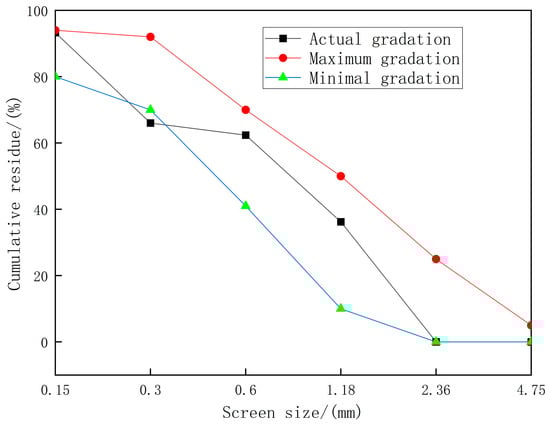 The emulsified asphalt used in this study was an anionic slow-cracking type, formulated with 70# base asphalt and JY-AFF1 anionic emulsifier supplied by China Zhejiang Jinyang Company. The solid content of the emulsified asphalt is 60%. Its physical and mechanical properties are shown in Table 1. The cement is ordinary Portland cement of P·O 42.5 grade, and its physical and mechanical properties are shown in Table 2. The sand used in the test is machine-made sand. The density is 2.64g/cm3. The fineness modulus is 2.58. The maximum particle size is 2.50mm. The sand gradation is shown in Table 3 and Figure 1. The water reducer is a kind of polycarboxylic acid high-efficiency water reducer produced by China Shanxi Feike New Material Technology Co., Ltd. with a water reduction rate of 25%. The expansion agent is a UEA expansion agent produced by China Laiyang Hongxiang Building Admixture Factory. The defoamer is a type of silicone defoamer.
