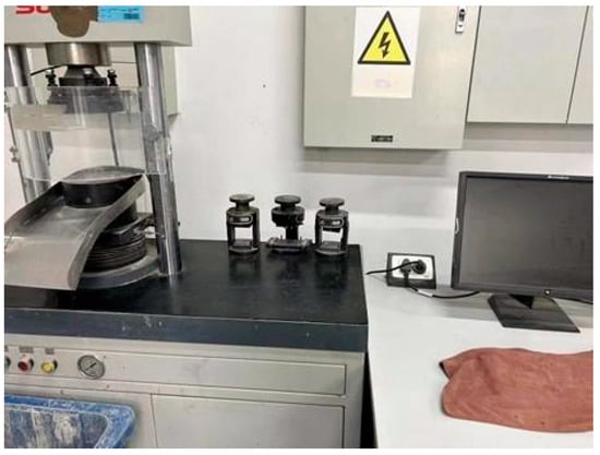 The compressive strength was measured using an electronic universal testing machine, as shown in Figure 2. According to the method specified in the standard of Interim Technical Specifications for Cement Emulsion Asphalt Mortar for CRTS II Type Slab Ballastless Track on Passenger Dedicated Line Railways, the uniaxial compression test was performed on the specimens.