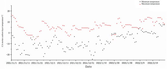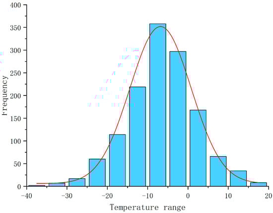 In order to determine the temperature of the Freeze–Thaw cycle, the temperature distribution range of the CA mortar cushion layer was calculated by the cumulative frequency method. All dates that meet the Freeze–Thaw cycle in the 12 years from 2011 to 2023 were extracted. The daily minimum temperature and daily maximum temperature were sorted from low to high according to the temperature. The temperature threshold range with a confidence level of more than 95% for Freeze–Thaw alternation within 12 years was clarified. As can be seen from Figure 5, the main temperature range for Freeze–Thaw cycles between 2011 and 2023 was between −20 °C and 10 °C. The Freeze–Thaw cycle temperature range was set to −20~10 °C.