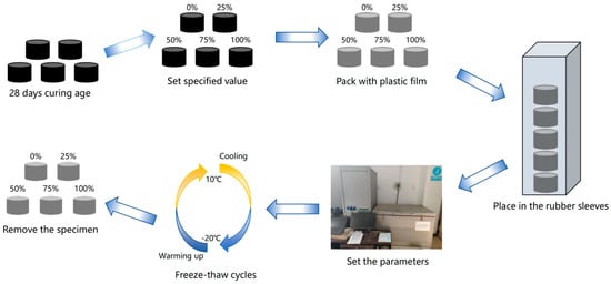 The Freeze–Thaw cycle is carried out on CA mortar by the DR-01concrete Freeze–Thaw test machine produced by China Beijing Aerospace Test Equipment Technology Co., Ltd. The specific process is shown in Figure 6.