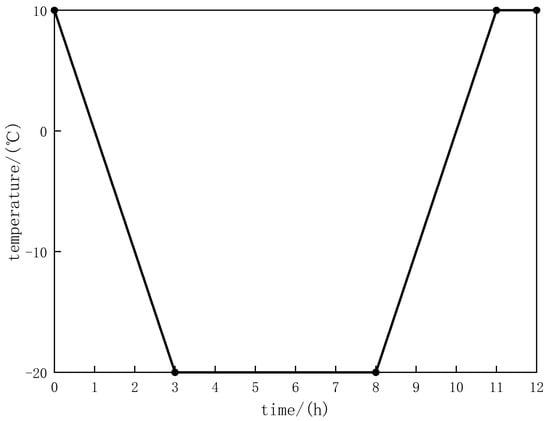 6. The heating condition was that the temperature at the center of the specimen reached the specified temperature 2 h later, or when the freezing time reached 8 h, the temperature started to rise. The cooling condition was that the temperature at the center of the specimen reached the specified temperature 2 h later, or when the melting time reached 4 h, the temperature started to fall. Temperature profile of Freeze–Thaw cycles is shown in Figure 7.