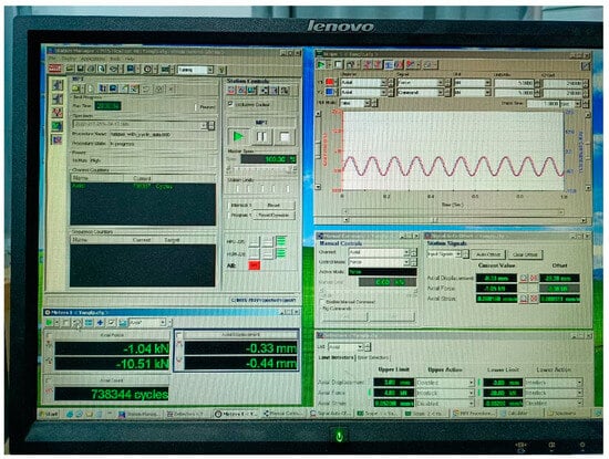 The fatigue test was conducted using an MTS universal testing machine. The fatigue loading form of CA mortar is axial compression. The loading frequency is 10 Hz. The sine wave was adopted as the test loading waveform. The loading process is shown in Figure 8 and Figure 9. Before formal loading, the upper and lower surfaces of the specimen were polished to keep the upper and lower surfaces of the specimen flat and free of obvious defects. This will reduce the data error caused by the uneven surface of the specimen. In addition, CA mortar was always packaged with plastic film to prevent moisture exchange between the CA mortar specimen and the atmosphere. During the test, fatigue loading peaks loads, fatigue loading trough loads and displacements were gathered, and the full-cycle stress and strain data were collected once every 100 cycles. In order to reduce the test error, 3 parallel specimens were measured under the same fatigue stress.