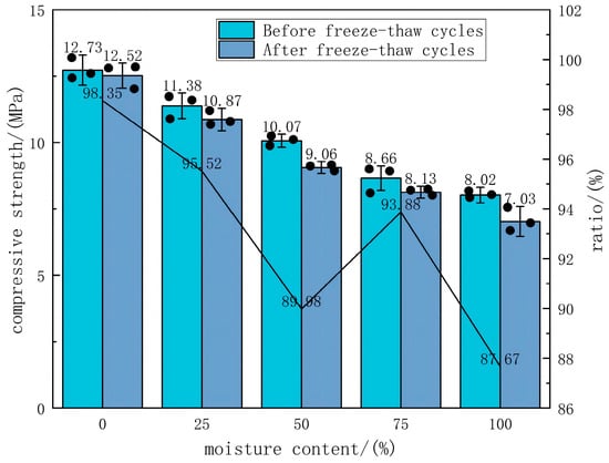 According to the test method, the compressive strength tests were carried out on CA mortar specimens with different moisture contents before and after the condition of Freeze–Thaw. The test results are summarized in Table 6.